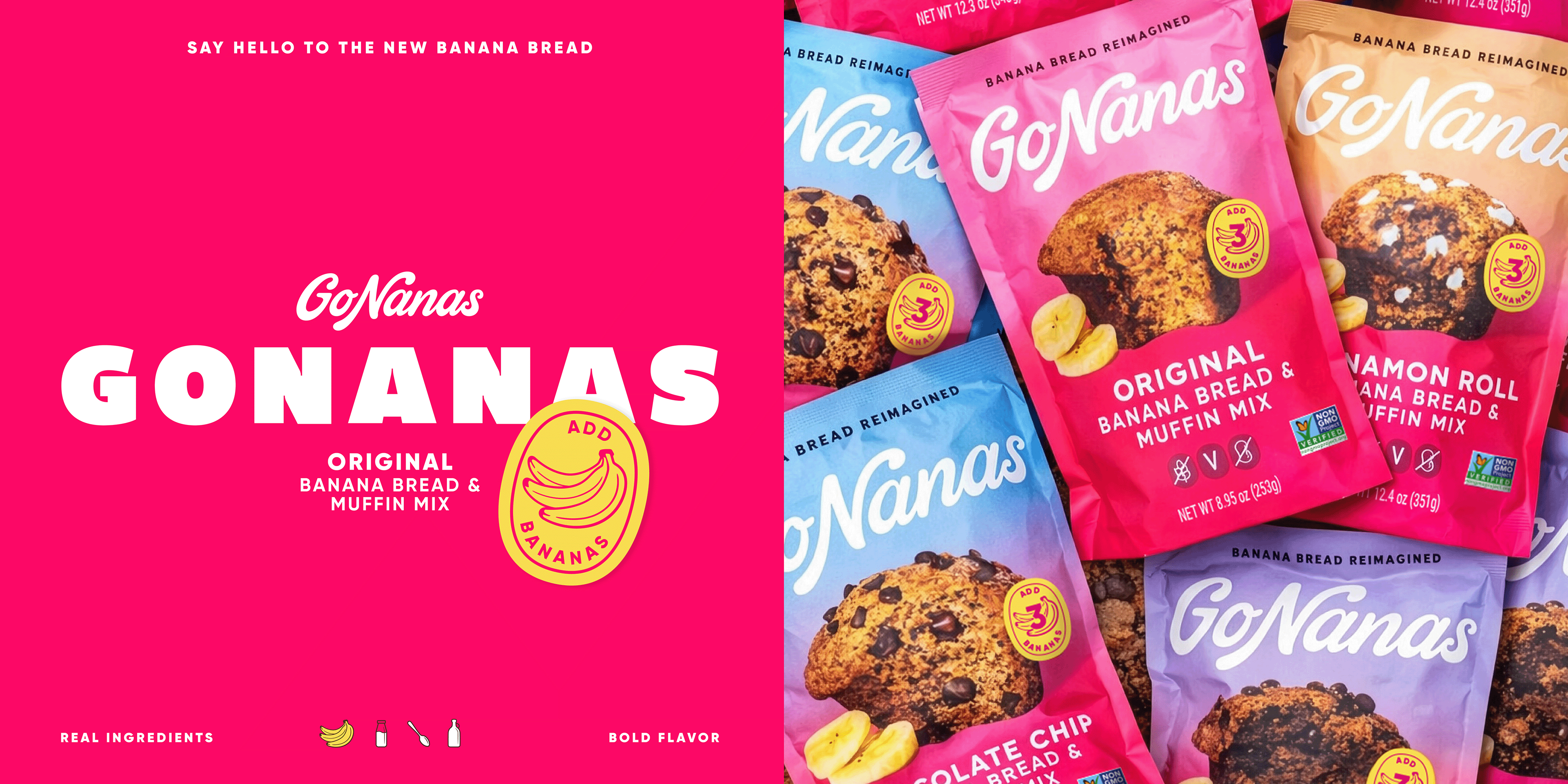 The final design leads with pink for its stopping power in store, while the gradient nods to flavor mixing, helps shopability, and adds modernity. The result is a confident, craveable refresh that stands out on shelf and scales across the portfolio. Backed by standout design and breakout research results, GoNanas is ready to claim its place as the new icon of modern baking.